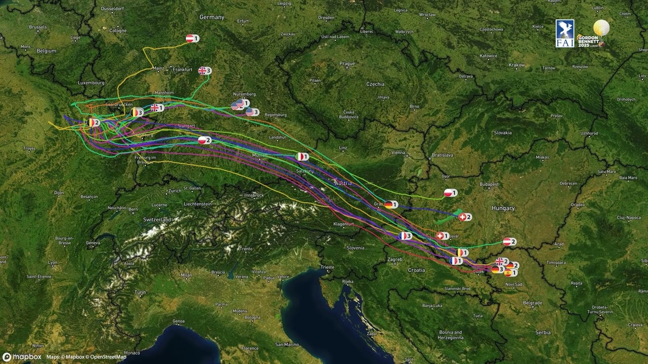 ✨ At the #GordonBennett race, the gas balloons lifted off from Metz, France, and after 67h 34m in the air, 🥇🏆 Team SUI-1 (Kurt Frieden & Pascal Witprächtiger) soared 1,358 km non-stop all the way to Gogosu, Romania!